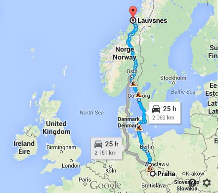 ČR,Polsko,Německo(Saznic,Rostock)-trajekt-Švédsko(Trelleborg),Norsko.